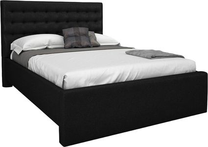 Ce lit Liverpool est composé d'une tête de lit capitonnée, de côtés de lit capitonnés, d'une plateforme en panneaux de particules et d'un pied de lit Absolu.