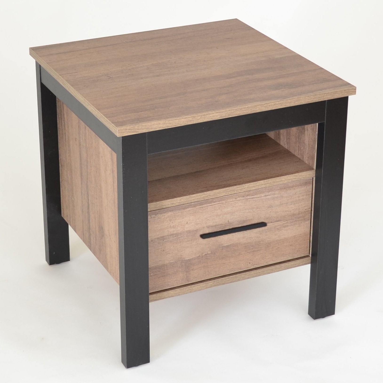 Cette table de bout est dotée d'un tiroir avec poignée en métal.